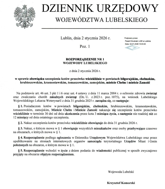 Wojewoda lubelski wydał rozporządzenie o obowiązkowym szczepieniu kotów przeciwko wściekliźnie. Przepisy obowiązują m.in. w powiecie chełmskim i mają na celu ograniczenie ryzyka rozprzestrzeniania się tej groźnej choroby.